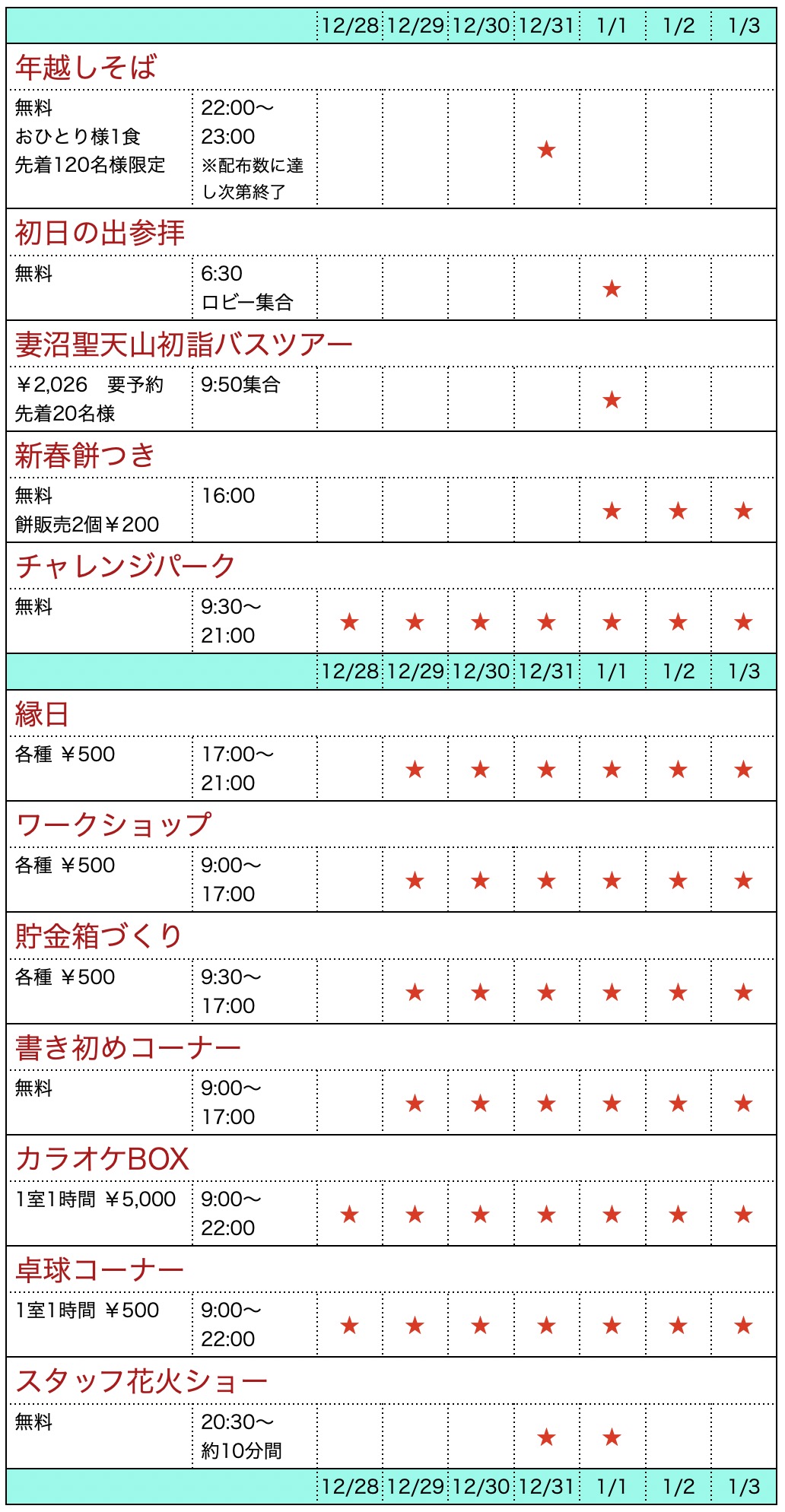 | イベント内容 | 料金 | 時間 | 12/28 | 12/29 | 12/30 | 12/31 | 1/1 | 1/2 | 1/3 |
